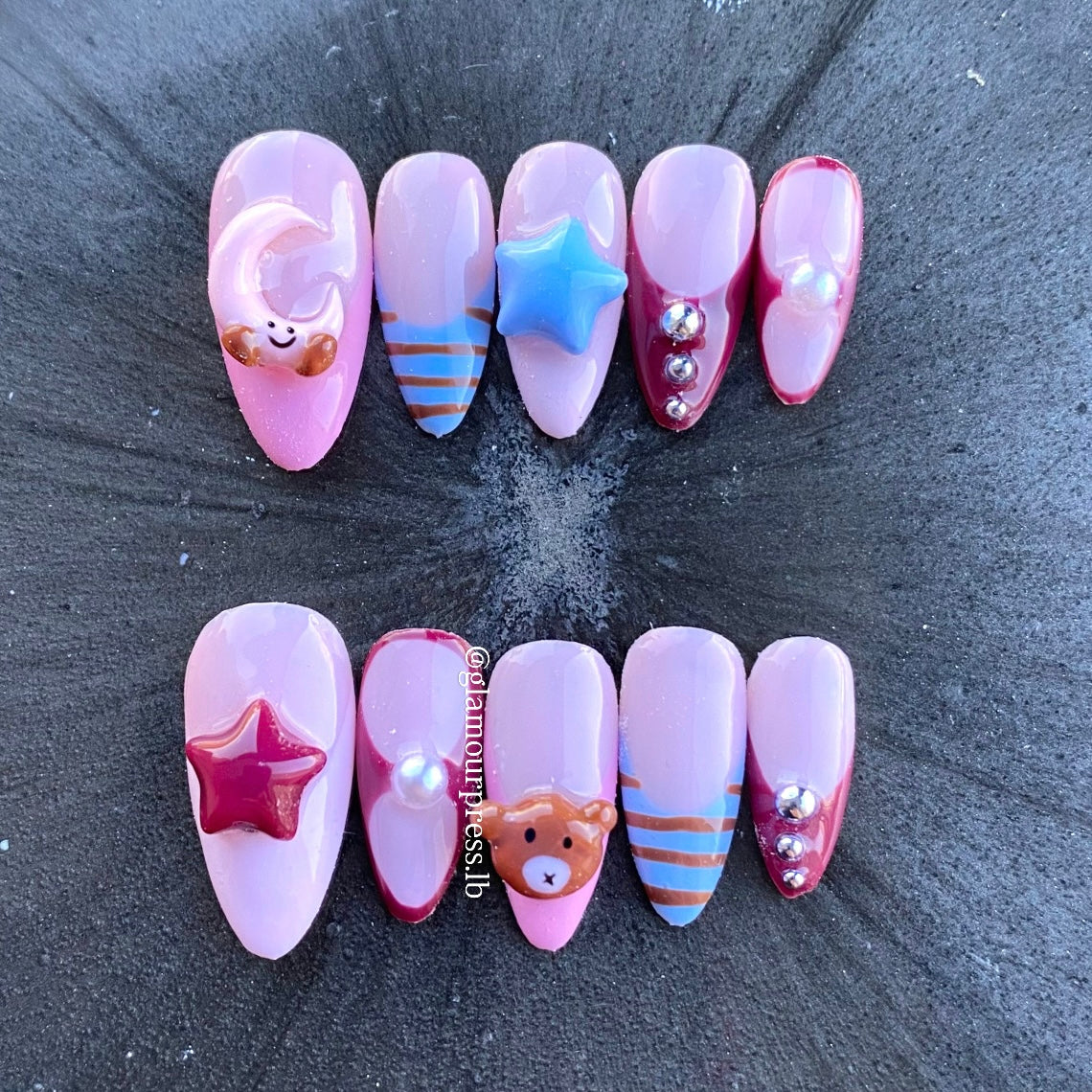 Drift into a world of soft nostalgia with Bedtime Stories, a dreamy press-on nail set inspired by cozy nights and starlit memories. Featuring delicate pink tone, charming accents, and subtle celestial details, this design captures the gentle magic of nighttime comfort.