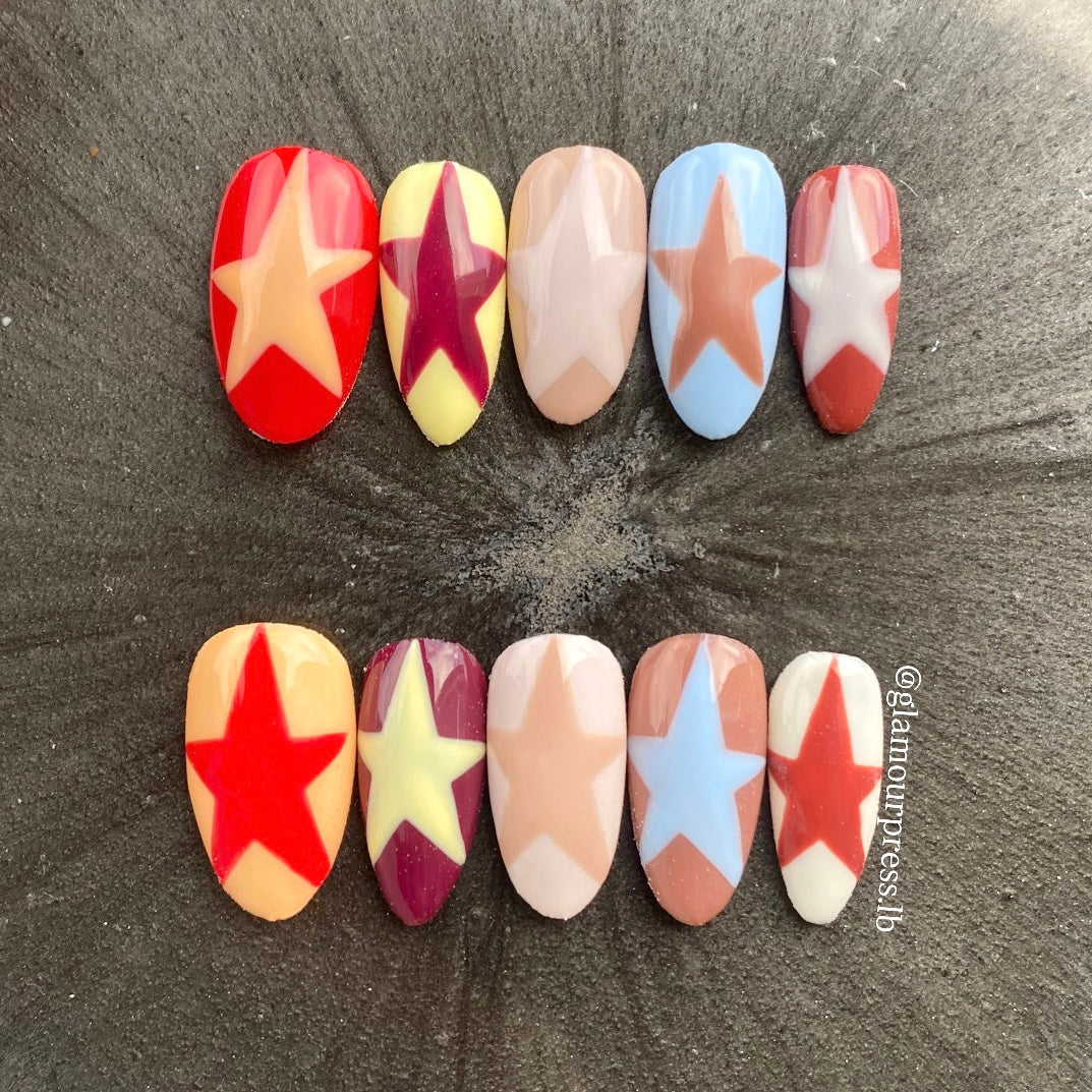 Stardust, a press-on nail set inspired by vintage charm and celestial beauty. Delicate star details rest over a harmonious mix of muted pastels and warm tones, creating a look that feels both timeless and modern.